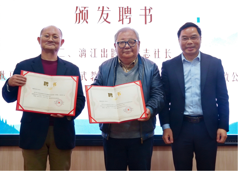 漓江出版社社长梁志(右)为吉狄马加(中)和朱振武(左)颁发“非洲文学译丛主编”聘书