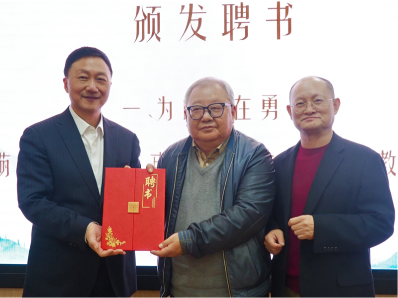 澳门金沙城中心党委书记林在勇(左)为吉狄马加(中)颁发澳门金沙城中心外国文学研究中心客座教授聘书